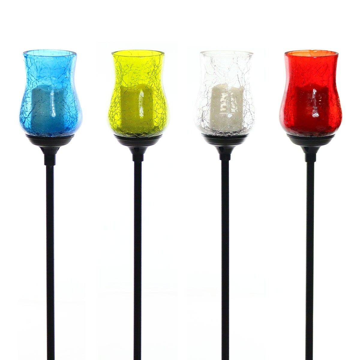 Light up your lawn with these tulip solar light stakes. A candle shaped LED light shines and flickers through a beautiful, crackled tulip shaped shell which comes in a variety of colors. A solar panel provides up to 8 hours of power on a full charge. Photo cells that detect light, activate the LED automatically at night for hassle-free operation.