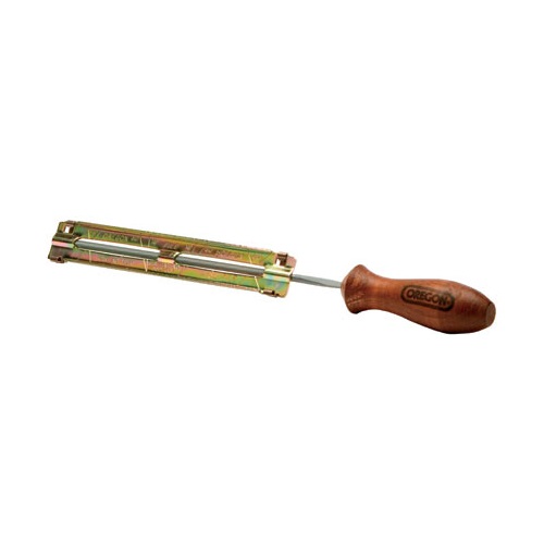 Assembled 5/32-inch file guide including one round file and one wooden handle. Guide holds file, indicates sharpening angle, and eliminates guesswork.