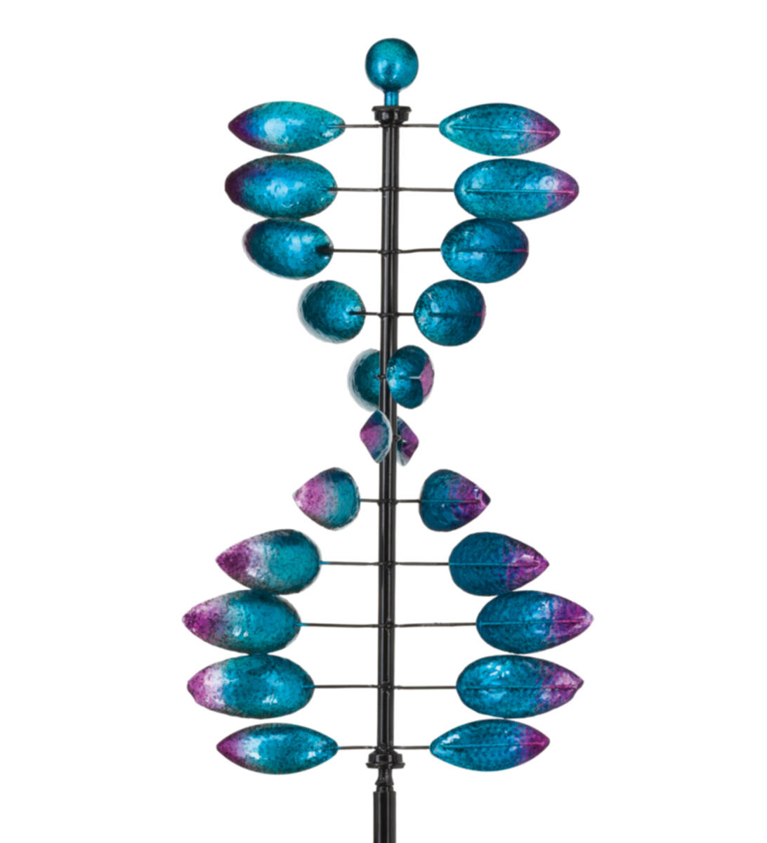 Metallic painted discs rotate sideways and heavy duty bearings allow each moving element to spin freely in opposite directions. Comes with a sturdy 5-pronged fork to secure the piece to the ground.