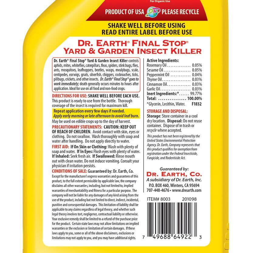 Final Stop® Yard & Garden Insect Killer Spray produces remarkable results, because all the ingredients are formulated to perform different tasks and functions synergistically. Our unique combination of natural ingredients works to kill immediately, yet controls insects for weeks with continued protection.