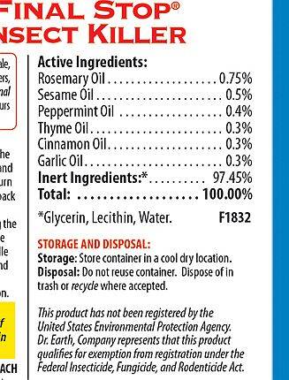 | Ingredients | Active: Rosemary Oil 0.06%, Sesame Oil 0.05%, Peppermint Oil 0.04%, Thyme Oil 0.03%, Cinnamon Oil 0.03%, Garlic Oil 0.02%; Inert Ingredients*: 99.77% *Glycerin, Lecithin, Water |