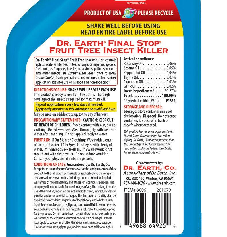 Final Stop® fruit tree insect killer spray is a natural killer that produces remarkable results, because all the ingredients are formulated to perform different tasks and functions synergistically, in a controlled fashion. Our unique combination of ingredients works to kill immediately, yet controls insects for weeks with continued protection.