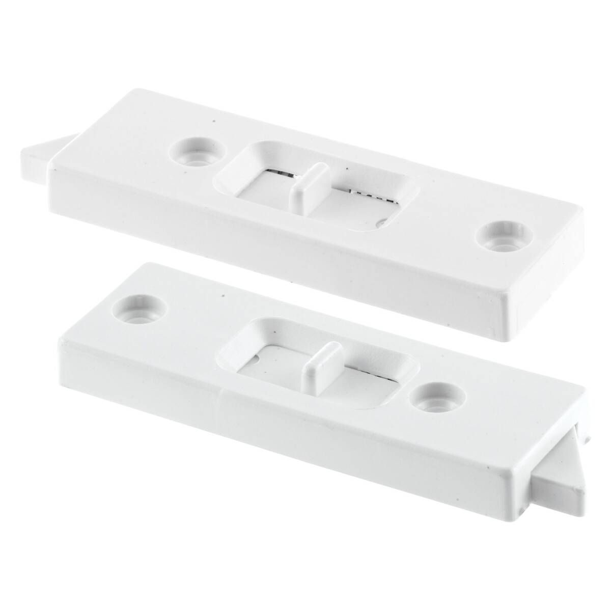 Tilt Latch, 2-inch, Plastic, White Spring-loaded latches for both single and double-hung vinyl windows. For use on sash panels designed to tilt-in and down from the top for cleaning. Injected molded plastic. One left and one right-handed latch.