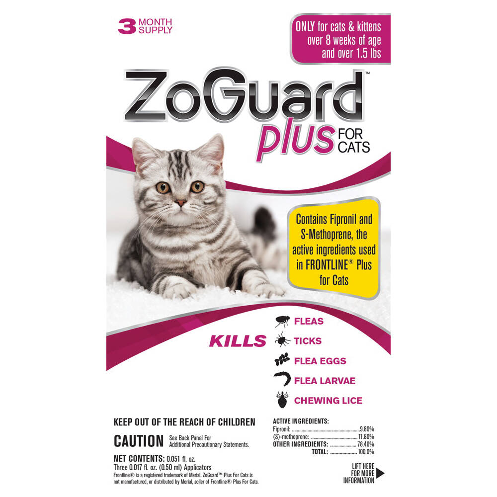 Topical spot-on product that contains fipronil and (S)-Methoprene, the active ingredients used in FRONTLINE® Plus. Works quickly to kill adult fleas and ticks while also eliminating flea eggs and larvae.
