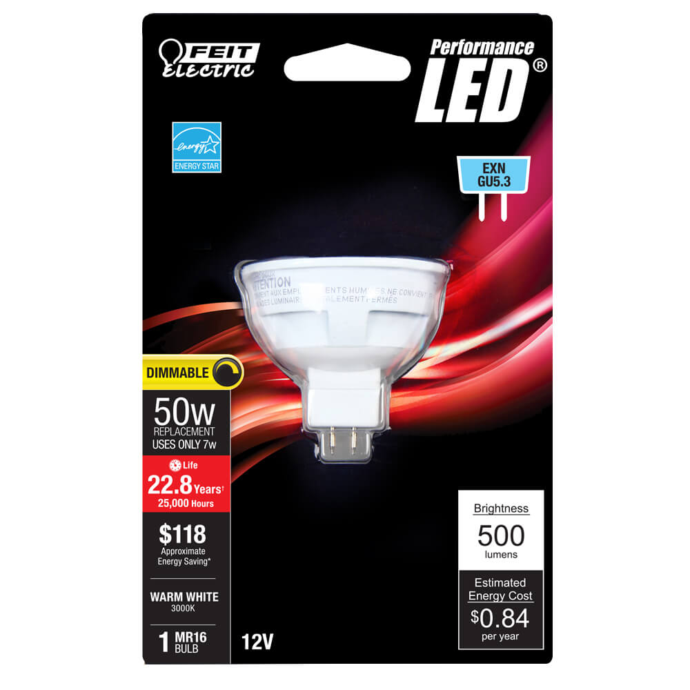 Enjoy all the benefits of advanced LED energy-saving technology with the Feit Electric BPEXN/500/LED MR16 50W LED Light Bulb. This 3000K warm white light is dimmable and will replace a 50-watt equivalent incandescent bulb. It produces a similar light output (500 lumens), uses 7 watts of electricity and up to 86% less energy than a standard incandescent light bulb. Get instant on to full brightness with relatively cool running performance. Feit Electric MR16 bulbs have an average life of 25,000 hours / 22.8 years are RoHS compliant and are 100% mercury free. Choose a dependable track and recessed lighting bulb for residential or commercial applications.
