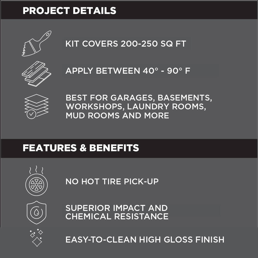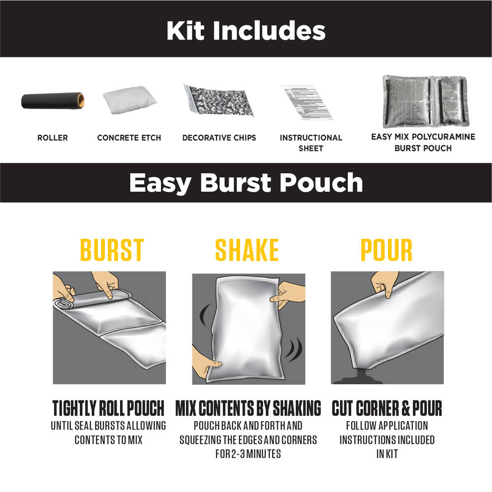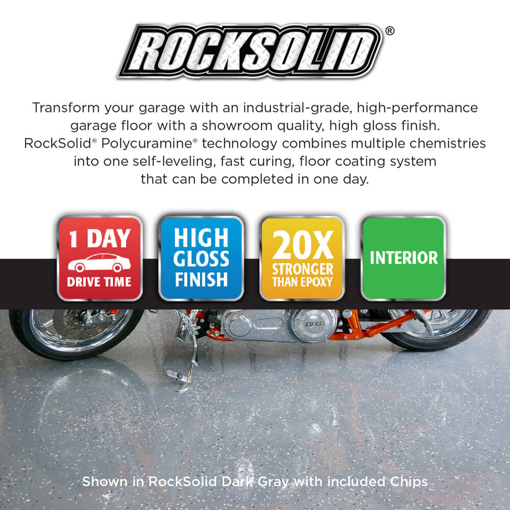 RockSolid Polycuramine Garage Floor Coating Kits come with the materials and tools needed to create a specialized floor with unparalleled durability and appearance. Low-odor formula is stronger than epoxy and resists chemical damage and hot tire pick up. Kit includes two-part easy-mix burst pouch, foam roller, decorative chips, concrete etch and instructions. For best results, properly prepare surfaces per instructions before coating.