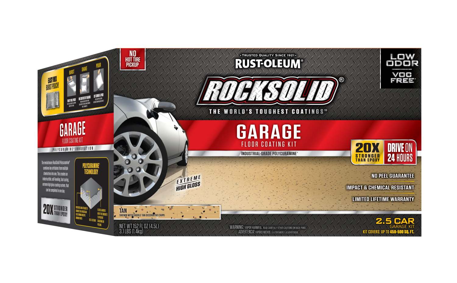 The Garage Floor Coating, like all RockSolid Polycuramine coatings, offers unsurpassed durability. Polycuramine is 20 times stronger than epoxy. With its resistance to salt, oil, gas and other harsh chemicals, this is one of the toughest floor coatings on the planet. It's easy to maintain and will last a lifetime while still looking fantastic.