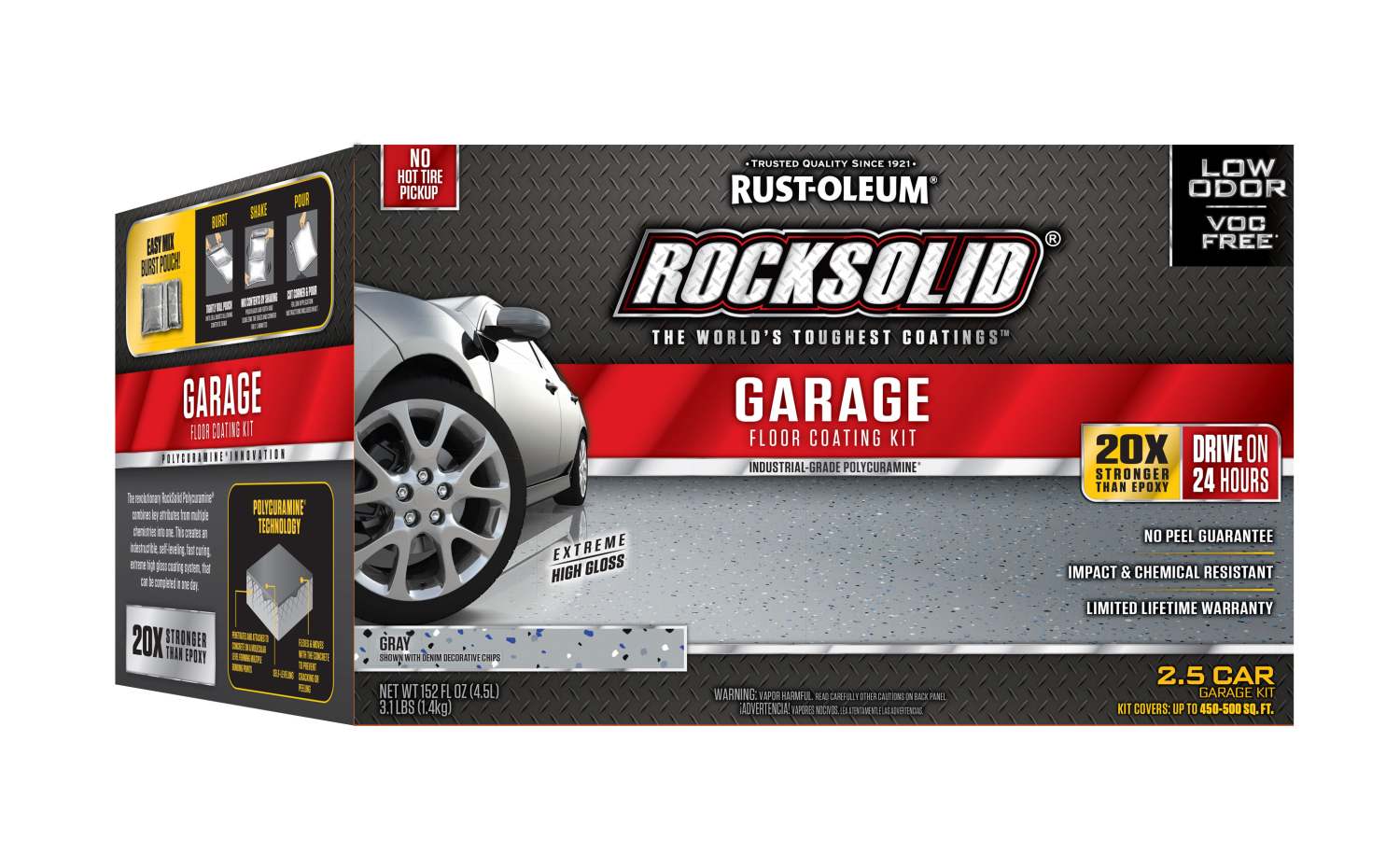 The Garage Floor Coating, like all RockSolid Polycuramine coatings, offers unsurpassed durability. Polycuramine is 20 times stronger than epoxy. With its resistance to salt, oil, gas and other harsh chemicals, this is one of the toughest floor coatings on the planet. It's easy to maintain and will last a lifetime while still looking fantastic.