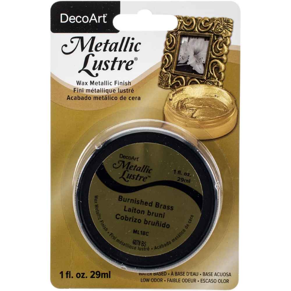 This 1-ounce Metallic Luster Burnished Brass paint is a water-based metallic wax paint designed to give small projects a rich, brass-like sheen. You’ll reach for it when you want quick, metallic highlights on home décor, picture frames, small furniture accents, knobs, or craft pieces—anywhere a burnished brass look adds warmth and depth. The formula dries quickly and leaves a reflective metallic finish that catches light for an authentic, aged-brass appearance. Cleanup is simple with soap and water, making it convenient for hobbyists and DIYers who dislike lengthy cleanup routines. Made in the USA, this compact metallic paint is ideal for touch-ups, layering, or combining with other finishes to achieve custom metal tones on wood, metal, or mixed-media projects.