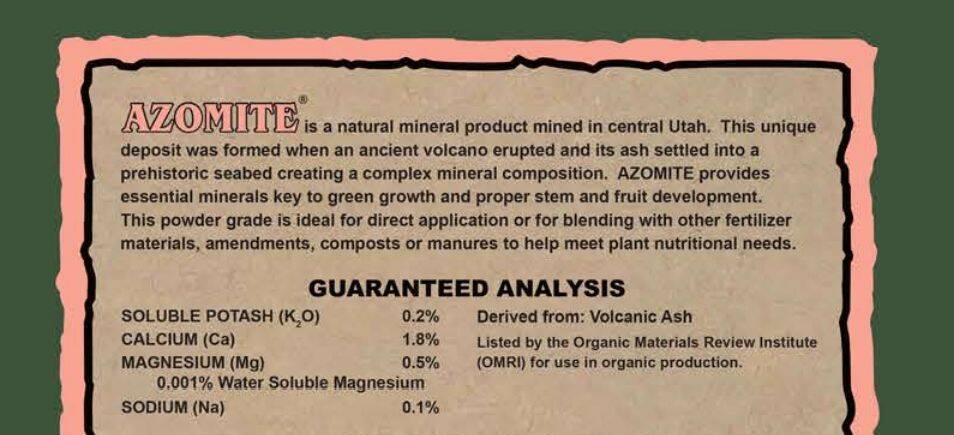 | Ingredients | Volcanic Ash. Listed by the Organic Materials Review Institute for use in organic production. |