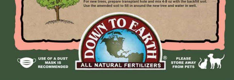 - Spread 1 lb per 2″ of trunk diameter around the base outwards to the drip line, mix into soil surface and water in well. For grapes, apply ½-1 lb around each plant and thoroughly mix into soil. For new trees, prepare transplant hole and mix 4-8 oz with the backfill soil. Use the amended soil to fill in around the new tree and water in well.