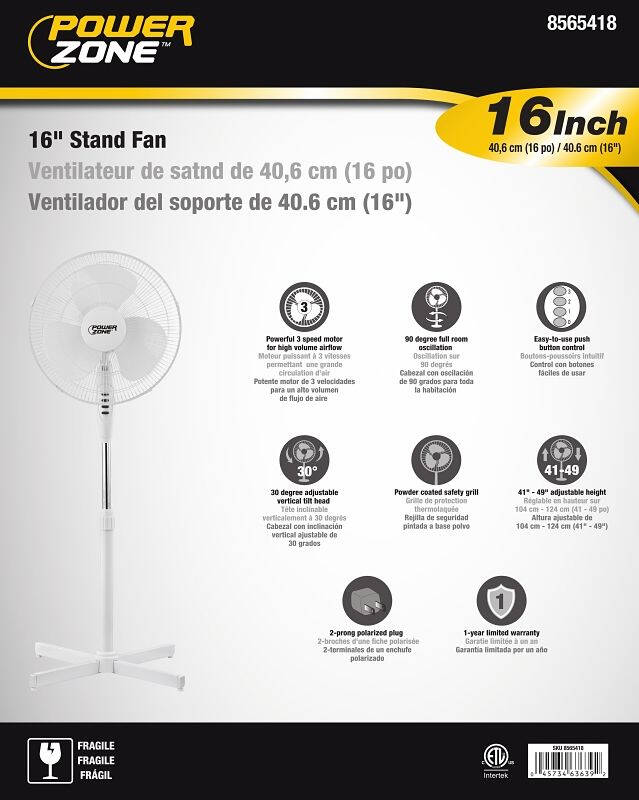 90 deg full room oscillation and 15 position tilt-back fan head. Whisper-quiet motor and easy push-button controls for three-speed including off, low, medium and high. Powder-coated safety grill. UL listed for safety.