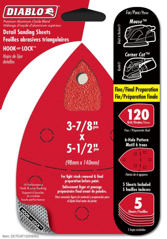 Diablo's premium 4-3/16 in. x 6-3/4 in.120-Grit Fine MegaMouse Detail Sanding Sheets with Hook and Lock backing include break-through innovations that improve performance, extend sanding life and increase productivity. These sanding sheets are designed for use in MouseÔäó Black and Decker?« and Corner CatÔäó Ryobi?« sanders and are ideal for all types of wood, metal and plastics.