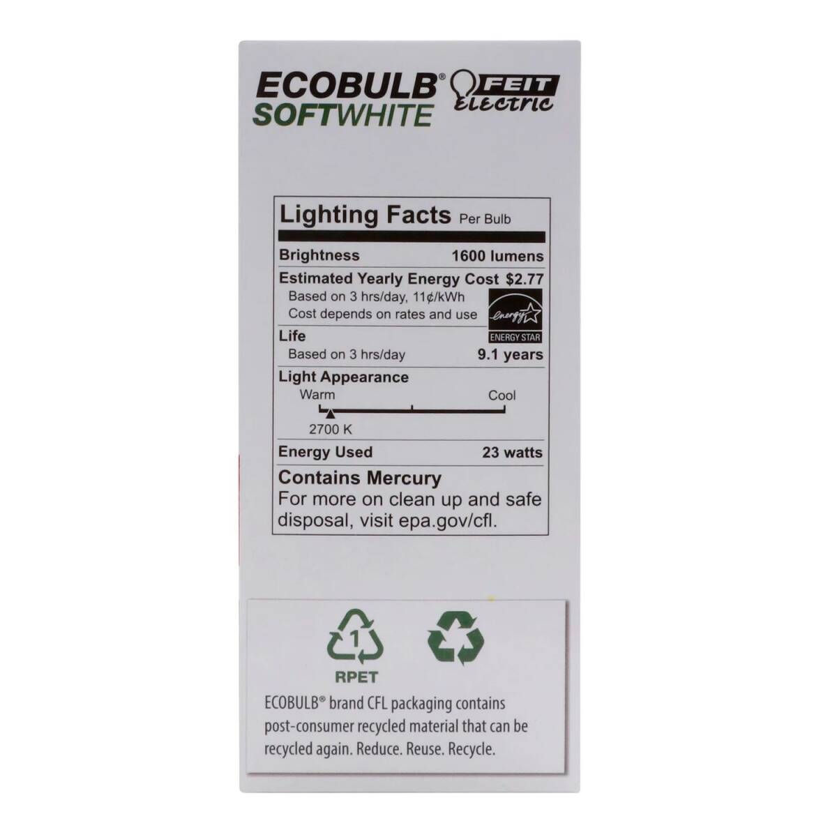 | Precautionary Statement | Contains Mercury. For more on clean up and safe disposal, visit epa.gov/cfl. See package for extended warnings and disposal information prior to use. |