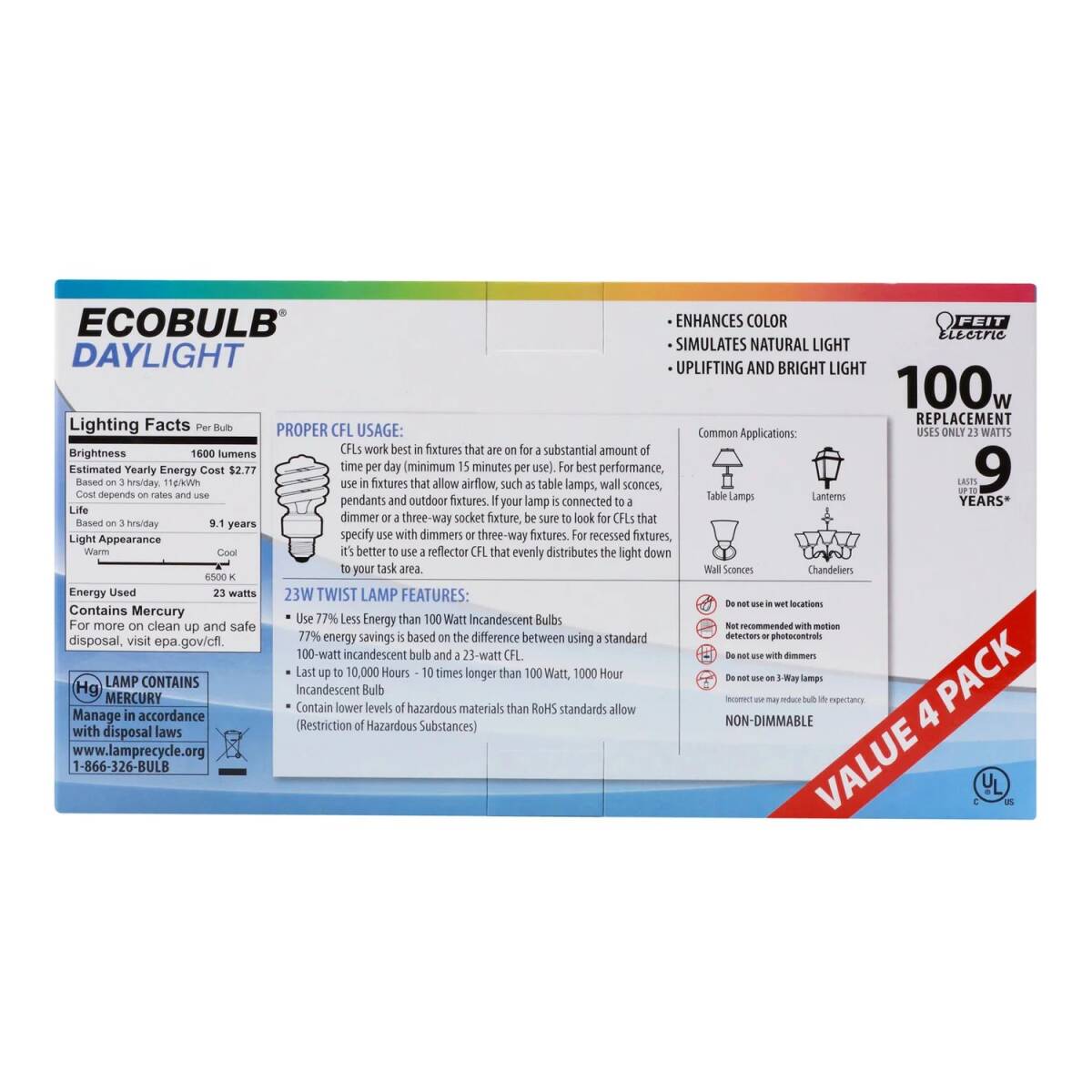 | Precautionary Statement | Do not use in wet locations. Not recommended with motion detectors or photocontrols. Do not use with dimmers. Do not use on 3-Way lamps. Incorrect use may reduce bulb life expectancy. See package for complete warnings and disposal information prior to use. |