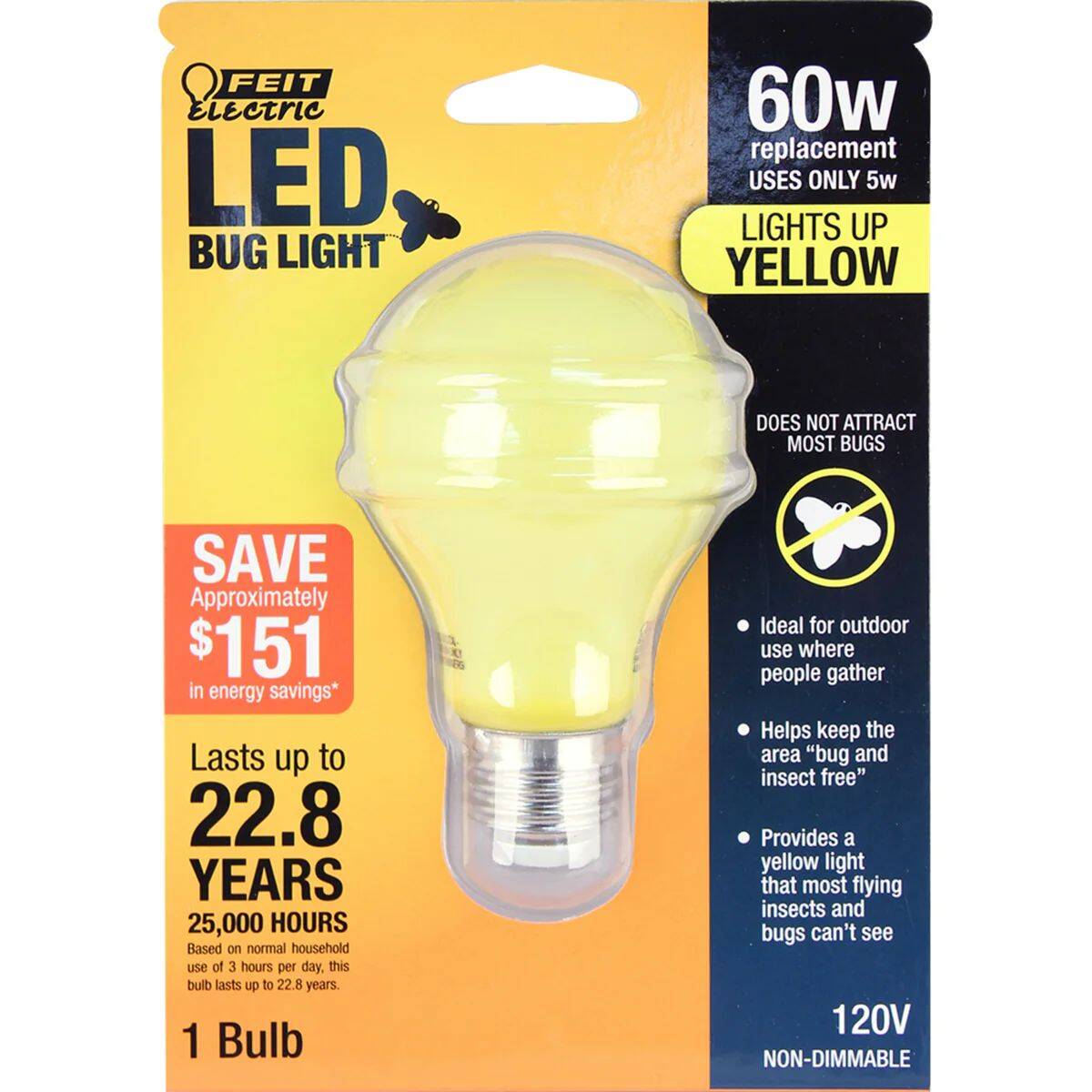 Shoo away annoying bugs and insects with advanced LED technology, the Feit Electric a19/bug/LED 60w LED bug light. Ideal for outdoor use, helps keep areas bug and insect free by producing a yellow light that most flying insects and bugs cannot see. This non-dimmable bug light will replace a 60-watt equivalent incandescent bulb, uses 5 watts of electricity and up to 92% less energy than a standard incandescent light bulb. Get instant on to full brightness with relatively cool running performance. Feit Electric bug lights have an average life of 25,000 hours / 22.8 Years are ROHS compliant and are 100% mercury free. Choose a dependable general purpose bug light for residential or commercial applications.