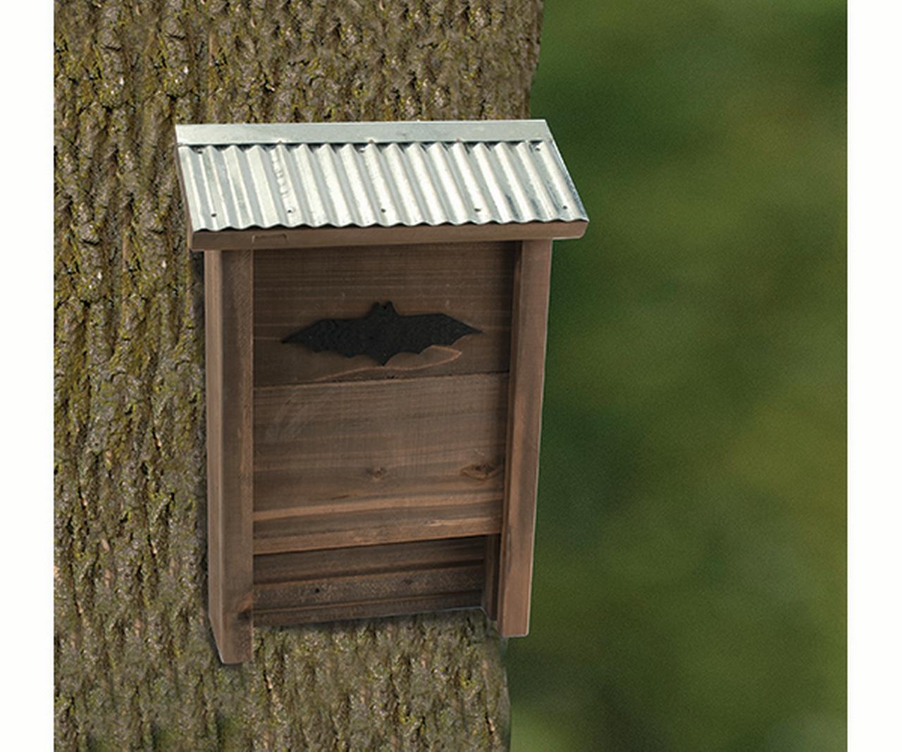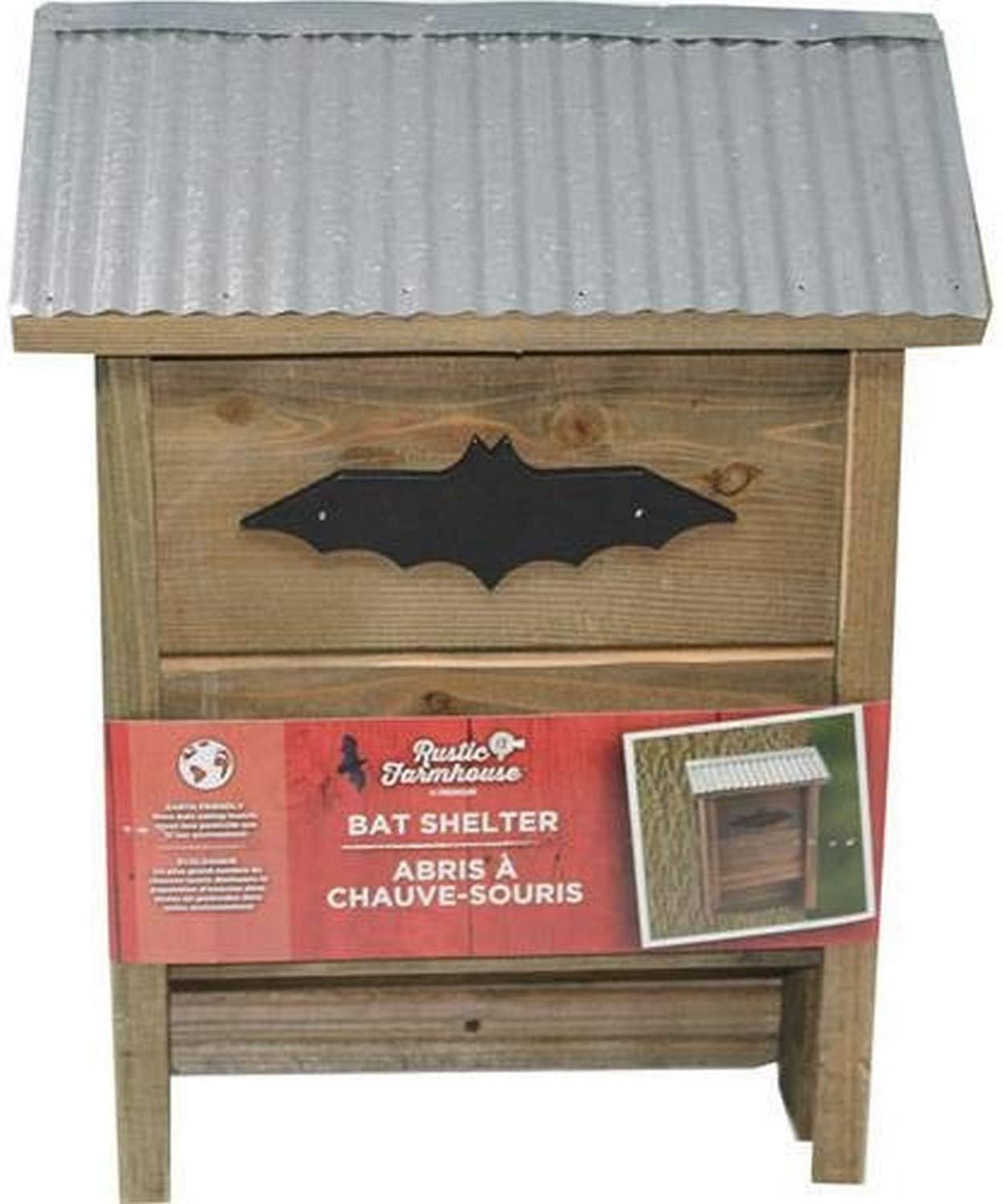 Our Rustic Farmhouse brand is on trend and incorporates popular rustic materials with functional design. This large Bat House is specifically designed to attract bats. The rustic shelter features corrugated galvanized metal roof with metal bat decoration and a rustic stain. The single chamber shelter has solid wood under the galvanized roof to provide insulation. Mount this house to the side of a building or a tree in a sheltered area, preferably 8-ft or higher. Can hold 25 bats.