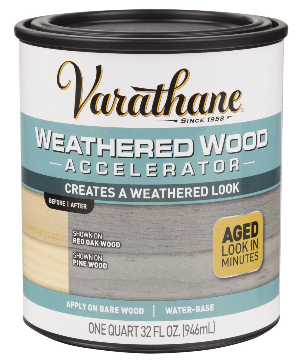 Varathane Weathered Wood Accelerator creates a weathered look on bare or untreated wood. It replicates the aging process that happens in nature by reacting with the wood to create a unique one-of-a-kind aged gray look. No need to find an old barn or old wood to get a reclaimed look.