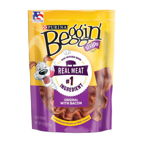 It's the strip that started it all. Meat-crazed canines won't believe their noses when they get a whiff of these bacony, mouthwatering dog treats made with real meat as the first ingredient. Each meaty bite smells like sizzlin' bacon, taste like savory bacon, heck it's even made with real bacon. And best of all, every Beggin' strip is proudly produced right here in USA facilities.
