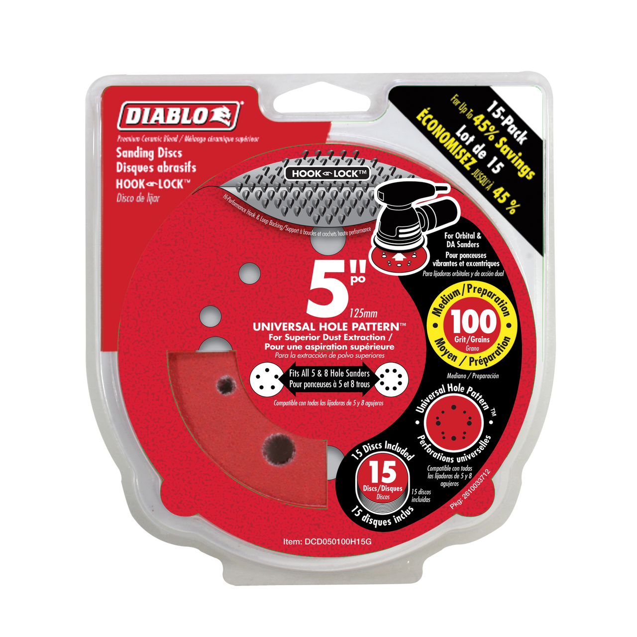 This 5-inch Diablo Ros Disc Hook and Lock 100-grit sanding disc is designed for fast, consistent material removal on orbital and DA sanders. You’ll want it when you need aggressive but controlled sanding on wood, metal, and plastics thanks to a premium ceramic grain blend that balances long life with quick cut rates. The universal hole pattern fits all 5- and 8-hole sanders for fast alignment, while the premium Hook and Lock backing lets you repeatedly attach and remove discs without sacrificing a secure connection. Diablo’s Clog-SHIELD formulation helps reduce pitch build-up and clogging so the disc stays cutting longer and maintains consistent performance. Finished in red, this 5-inch, 100-grit disc is a practical choice for shaping, smoothing, and prep work across a range of workshop and jobsite tasks.
