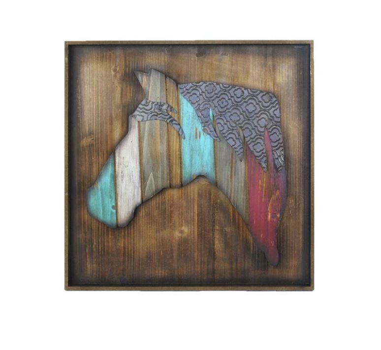 Wood and steel combine to form this fun Horse Head Wall Art. Perfect for any equestrian or western art lover. Colorful design will blend with many decor styles. Imported.