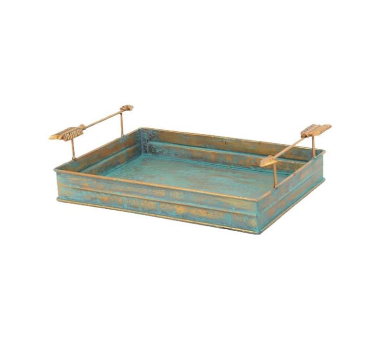 This gorgeous tray will quickly become your go to favorite. Turquoise patina finish with copper look arrow handles this tray will blend in perfectly with several decor styles. Not recommended for food use. Imported.