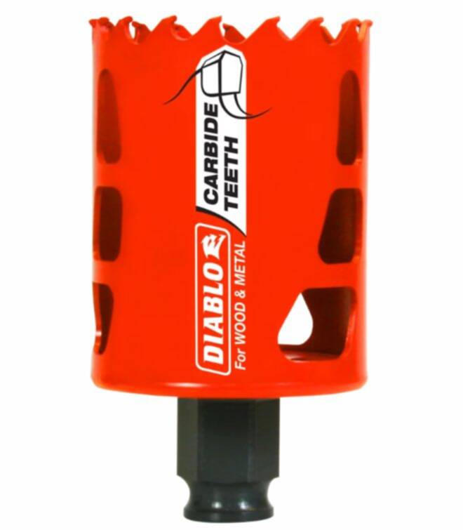 Diablo introduces the first carbide-tipped hole saws on the market to cut both wood and metal (wood, nail-embedded wood, plastic, aluminum, metal, cast iron, stainless steel and metal). Delivering 50 times longer cutting life than bi-metal, these new carbide-tipped hole saws offer faster cutting performance and increased productivity.