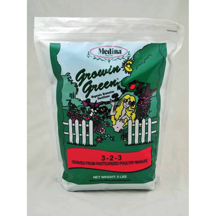 Medina growing green organic fertilizer is a natural fertilizer for all of your gardening needs. It is derived from humate, pasteurized poultry manure and molasses. Medina growin green fertilizer will green up your lawn quickly and is pasteurized for stability and odor reduction. Medina growin green fertilizer is slowly released from natural sources for continuous feeding and continues the growth response through all the seasons. The ammonium source is quickly available for noticeable fast results. Calcium helps improve the cell structure of plants. Medina growin green fertilizer also helps breakdown thatch biologically when grass clippings are not picked up. It produces three stages of activity including balanced nutrient supply, structure repair through soil supplementation, and nutrient availability. Good for your lawn, flowers, trees, vegetable garden, ornamentals, or pot plants. OMRI listed.