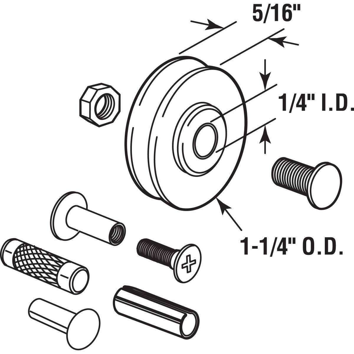 Roller and Axle Kit, 1-1/4-inch, Steel Ball Bearing, Center Groove Center grooved, universal design: 1-1/4-inch steel ball bearing roller and axle kit. Roller has a steel inner race and 1/4-inch hole. Installation kit includes assorted axles used to repair sliding door roller assemblies.