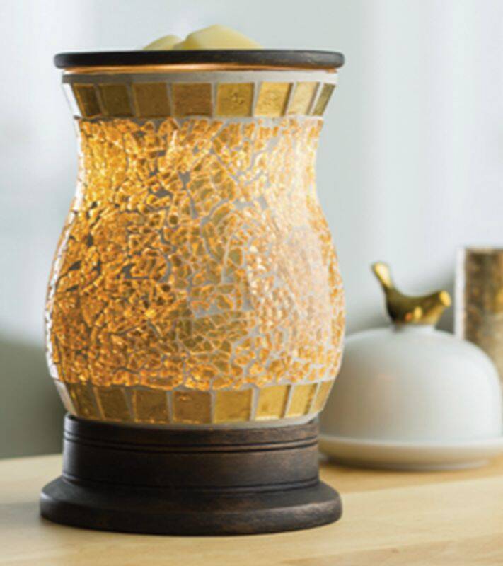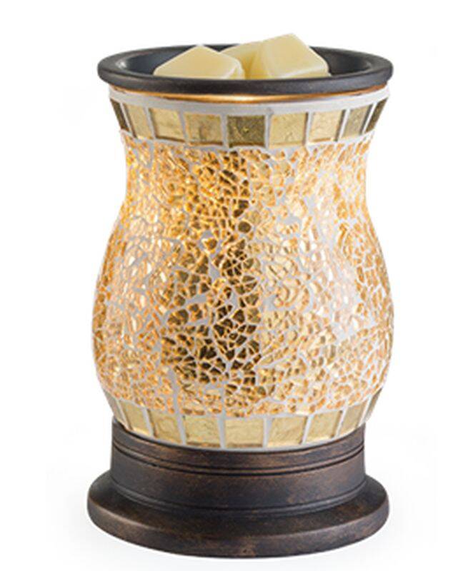 The gold glass mosaic surface of this Illumination Warmer sparkles as it emits a soft glow. Gold squares border the top and bottom. Dish is removable; includes warming bulb. Simply add wax melts to the dish, turn it on, and enjoy your favorite fragrance as it spreads through the room.