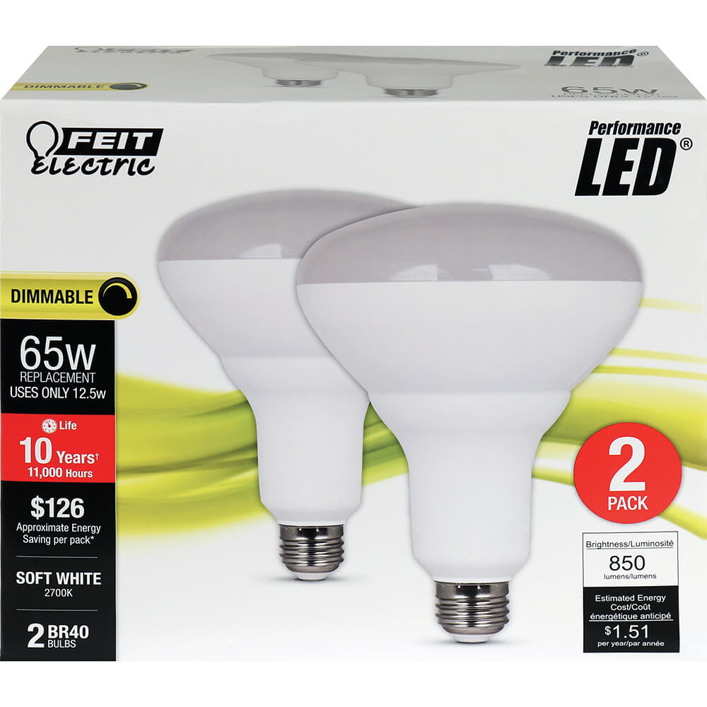 Enjoy all the benefits of advanced LED energy-saving technology with the Feit Electric BR40DM/10KLED/2 2-Pack BR40 65W LED Light Bulb. This 2700K soft white light is dimmable and will replace a 65-watt equivalent incandescent bulb. It produces a similar light output (850 lumens), uses 9.5 watts of electricity and up to 79% less energy than a standard incandescent light bulb. Get instant on to full brightness with relatively cool running performance. Feit Electric BR40 bulbs have an average life of 11,000 hours / 10 years are RoHS compliant and are 100% mercury free. Choose a dependable track and recessed lighting bulb for residential or commercial applications.