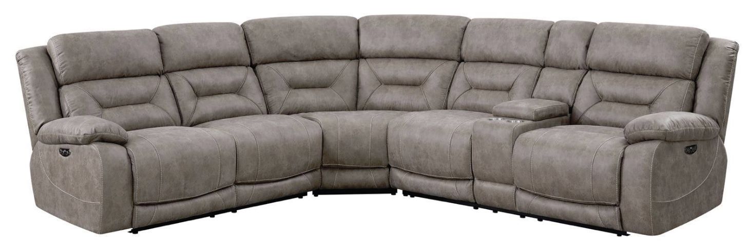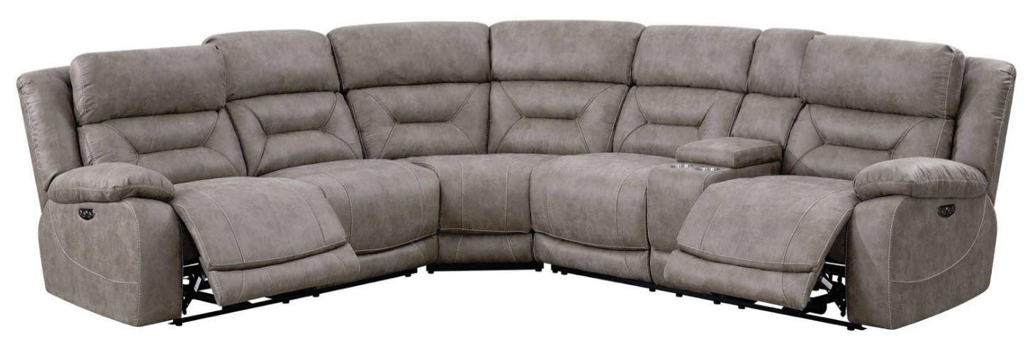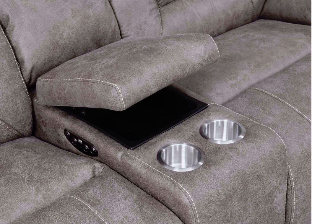 The ultimate in reclining comfort, Aria has power functions built throughout. Shown in desert sand colored polyester material, the sectional offers power footrest and power articulating headrest so you never have to sacrifice comfort to watch your favorite shows. The power control panel features a USB port for recharging devices and a home button to return each recliner to its original position.