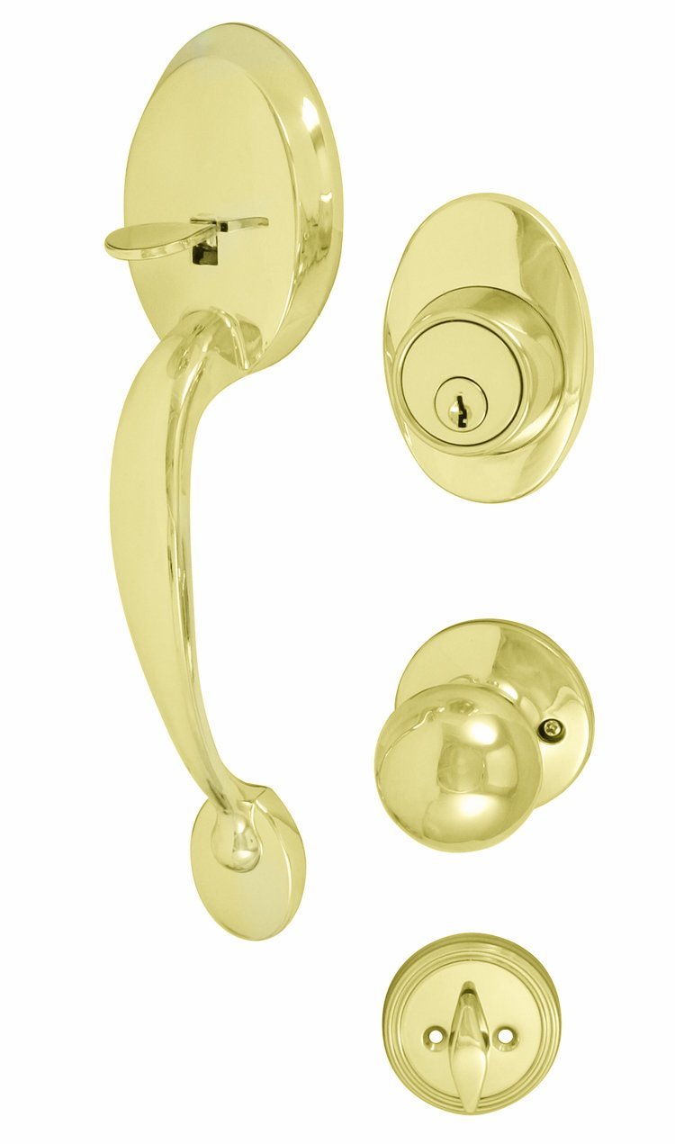 Cheltenham Polished Brass Handle Set has a removable 5 pin tumbler cylinder, it is reversible, non-handed, fits doors 1-3/8-Inch to 1-3/4-Inch thick and fits standard 2-1/8-Inch installation hole. High security 1-Inch throw on dead bolts with a 6-way adjustable latch. Meets Grade 3 specifications and has a limited lifetime warranty.