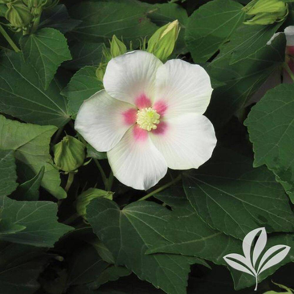 Features prolific 6 to 8-inch white flowers with a deep pink throat that bloom from late summer to fall. A hybrid between American and Asian species that provides hardiness and showiness. Reaches 5 ft tall and 3 ft wide. Has very disease resistant foliage.