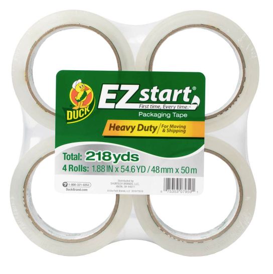 Skip the annoyance of moving and shipping tapes that split or tear. Duck Brand EZ Start Packing Tape is designed to be Frustration-Free so it always unrolls smoothly, easily and quietly. Featuring a long-lasting adhesive, you can keep your boxes and packages secure during shipping, moving and storage. Plus, the tape starts easily off the roll, eliminating the frustration of losing the tape end so you can pack up and leave the stress behind. This crystal clear packing tape unwinds quietly, so it's perfect to use in the office or at home.