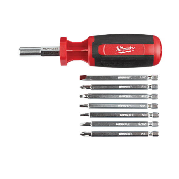 Our 9-in-1 square drive multi-bit driver features 3-1/2 in interchangeable power groove bits that are power tool compatible giving you maximum jobsite versatility. The multi-bit screwdriver also has wrench-ready hex shanks providing you with additional leverage. The interchangeable bits are precision machined and chrome-plated, providing marine-grade rust protection and reduced wear giving you the best jobsite durability. The screwdriver features magnetic bit retention providing you with consistent driving performance. The Milwaukee 9-in-1 square drive multi-bit driver is designed for the jobsite.