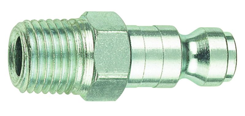 Recognized by the extremely short pilot. Has the widest metal section between the ball groove and the pilot. The sealing surface on the end of the nipple is wider than other interchanges, resulting in better sealing and longer seal life. Intended for compressed air lines only. 300 PSI maximum rated working pressure. PLUG-MALE AUTOMOTIVE DESIGN NPT In=1/4 Body Series In.=3/8