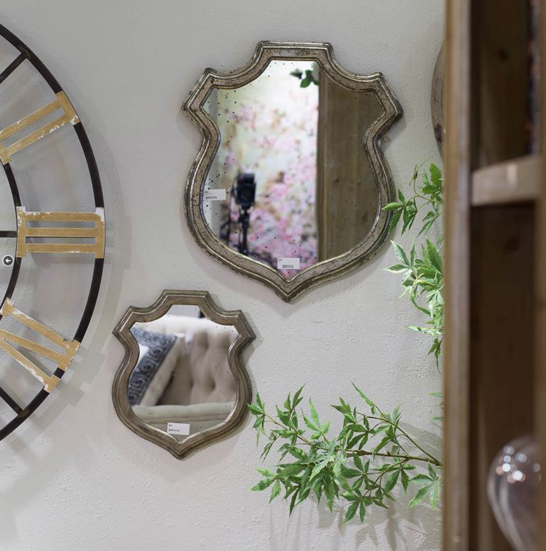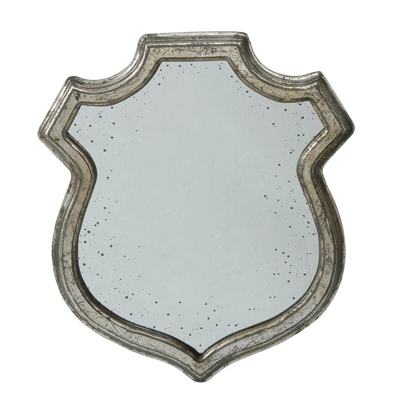 With its unique shield shape, the small Wide Empire Crest Mirror brings impressively grand style to any sized space. Hang in a foyer for a regal welcome or place in a bathroom for a look of unparalleled elegance. The antique silver frame and interesting shape make this piece a striking addition to any room with a globally-inspired decor.
