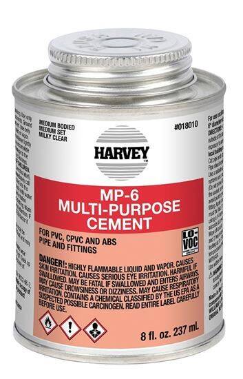 • MP-6 multi-purpose milky clear cement is a medium-bodied, medium-set cement formulated for use on all schedules and classes of ABS, PVC and CPVC pipe and fittings up to 6 in Dia with interference fit