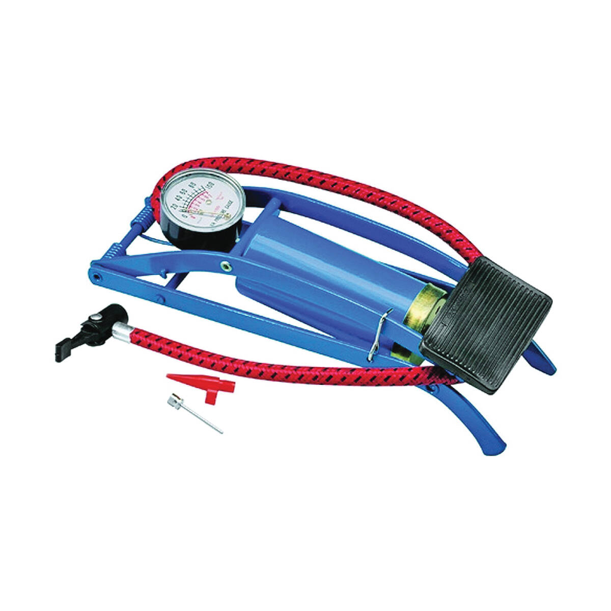 Foot operated. Pumps up balls, tires and other inflatables without batteries or a motor. Heavy-duty, compact design. Inflates up to 100 psi. Fast action with pressure gauge. Includes nozzle adaptors for rafts and sports balls.