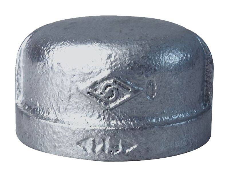 The galvanized cap is a class 150 malleable iron pipe fitting that is used for closing and terminating the male end of a pipe or fitting.