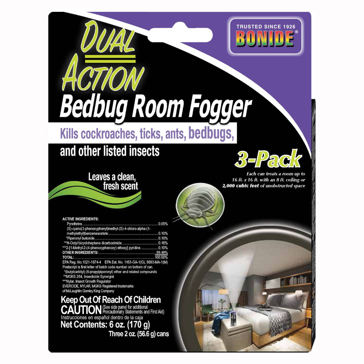 The Bonide Dual Action Bedbug Room Fogger is a ready-to-use fogger designed for homeowners who need fast, effective indoor pest control. Its dual action formula penetrates hiding spots to kill adult insects and their eggs, making it a practical choice for treating bed bugs and a wide range of other pests including cockroaches, fleas, ants, silverfish, mosquitoes, ticks, and more. Each fogger treats a room up to 16 ft. x 16 ft. with an 8 ft. ceiling (about 2,000 cu. ft.), and this three-pack provides coverage for approximately 6,000 cu. ft., so you can tackle multiple rooms or larger spaces. Use it in bedrooms, living areas, attics, basements, garages, boats, or cabins to reach cracks and crevices that sprays and traps might miss. Made in the USA by Bonide, this fogger offers an efficient way to regain control of infested indoor spaces.