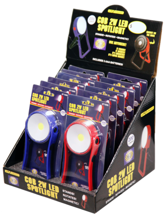 The SERVICE TOOL 2-Watt COB LED Spotlight is a compact, super-bright light perfect for quick tasks and hands-free work. It stands, rotates and has a magnetic back to attach to metal surfaces for repairs, camping or automotive use. Battery powered with 3 AAA batteries included and available in assorted colors.