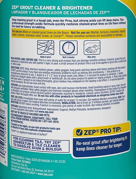 | Instructions | Test product in an inconspicuous area prior to use. If grout has been sealed, it is recommended to remove sealer with a strong stripper to prevent uneven cleaning results. Apply to a 2 ft. x 2 ft. area to grout seam only. Allow 2 to 3 minutes for product to penetrate. Agitate product over stubborn stains with a soft scrub brush or toothbrush. Do not allow product to splash on nearby surfaces. Rinse area thoroughly with clean water. If product is not rinsed thoroughly, grout residue may redeposit on tile causing a dull effect. Discard brush and sponge after use. A second application may be necessary. Do not use area until dry. Pro-Tip: Use this product is specifically designed for use on floor tile grout lines, so use it along with your tile floor cleaning regimen. |