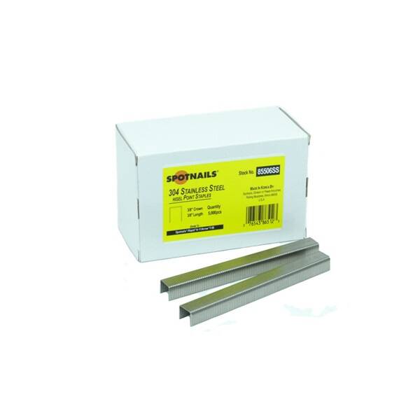 SPOTNAILS Staples, Crown Width: 3/8 in , Leg Length: 3/8 in , Point Type: Chisel, Material Gauge: 20 ga, Stainless Steel, Galvanized, Clear, Suitable for: Arrow T-50, HT-50, Bostitch PHT150C, TR100, TRE500, Duo-Fast Slapshot, Fasco F1A A11-16 Auto L/M, Interchange ICB-A11, Rapid A-11, R-11, Senco H Slap Hammer, Spotnails