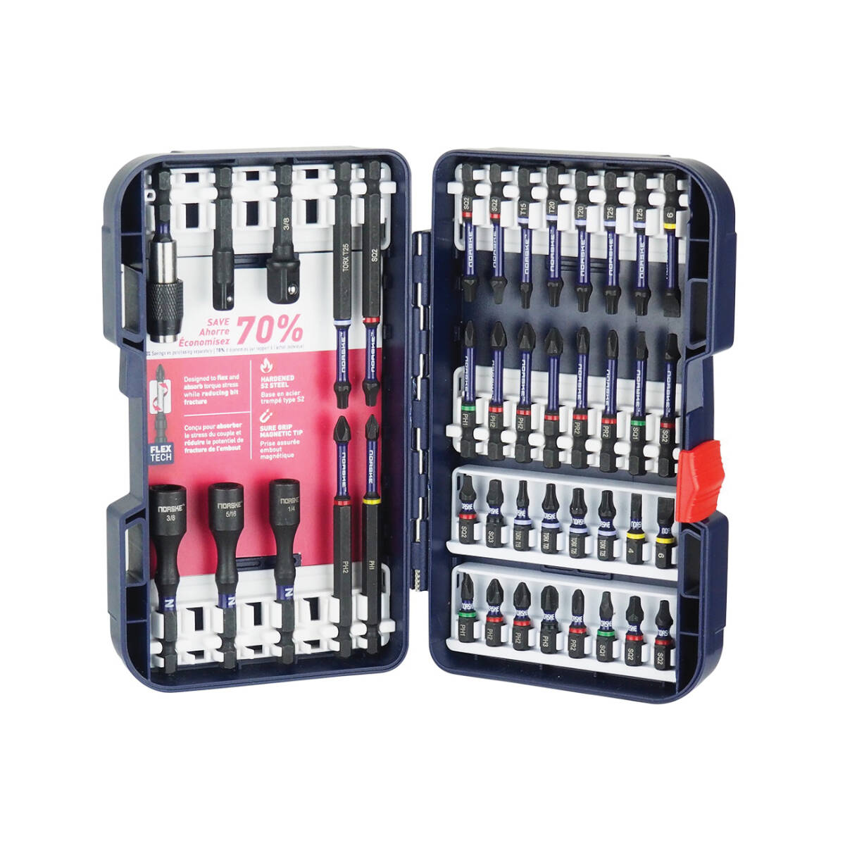 Norske Impact Torsion Bit Set, Steel, Number of Pieces: 42, Includes: 1 in Phillips #1, (2) #2, #3, 1 in PR #2, 1 in Square #1, (3) #2, #3, 1 in Slotted #4, #6, 1 in Torx T15, T20, (2) T25, 2 in Phillips #1, (3) #2, #3, 2 in PR #2, 2 in Square #1, (3) #2, 2 in TORX T15, (2) T20, (2) T25, 2 in Slotted #6, 2-3/4 in Phillips #2, 2-3/4 in PR #2, 2-3/4 in Square #2, 2-3/4 in TORX T25, Socket Adapters of 1/4 in , 3/8 in , 2-1/2 in , Nutsetters of 1/4 in , 5/16 in , 3/8 in and 1/4 in Magnetic Quick Change Bit Holder