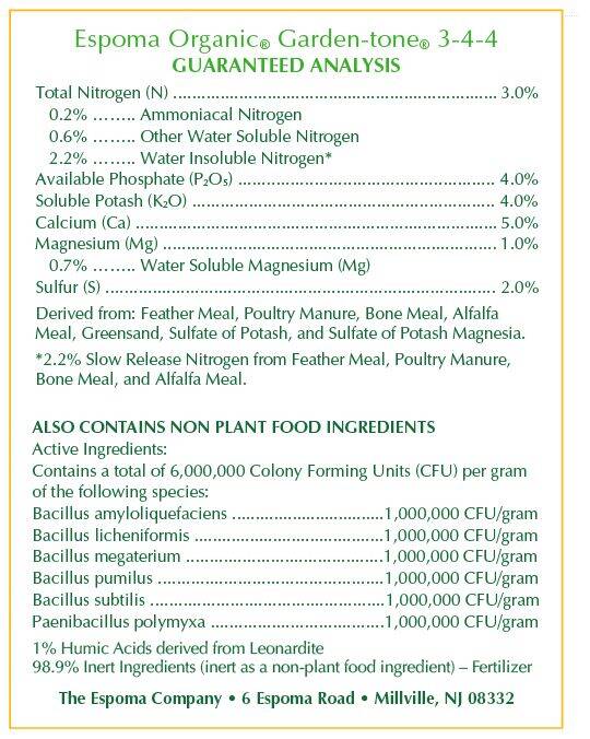 | Ingredients | Feather Meal, Poultry Manure, Bone Meal, Alfalfa Meal, Greensand, Sulfate of Potash, and Sulfate of Potash Magnesia. ALSO CONTAINS NON-PLANT FOOD INGREDIENTS. Active Ingredients: Contains a total of 6,000,000 Colony Forming Units (CFU) per gram of the following species: Bacillus amyloliquefaciens 1,000,000; Bacillus licheniformis 1,000,000; Bacillus megaterium 1,000,000; Bacillus pumilus 1,000,000; Bacillus subtilis 1,000,000; Paenibacillus polymyxa 1,000,000; 1% Humic Acids derived from Leonardite, 98.9% Inert Ingredients (inert as a non-plant food ingredient) – Fertilizer |