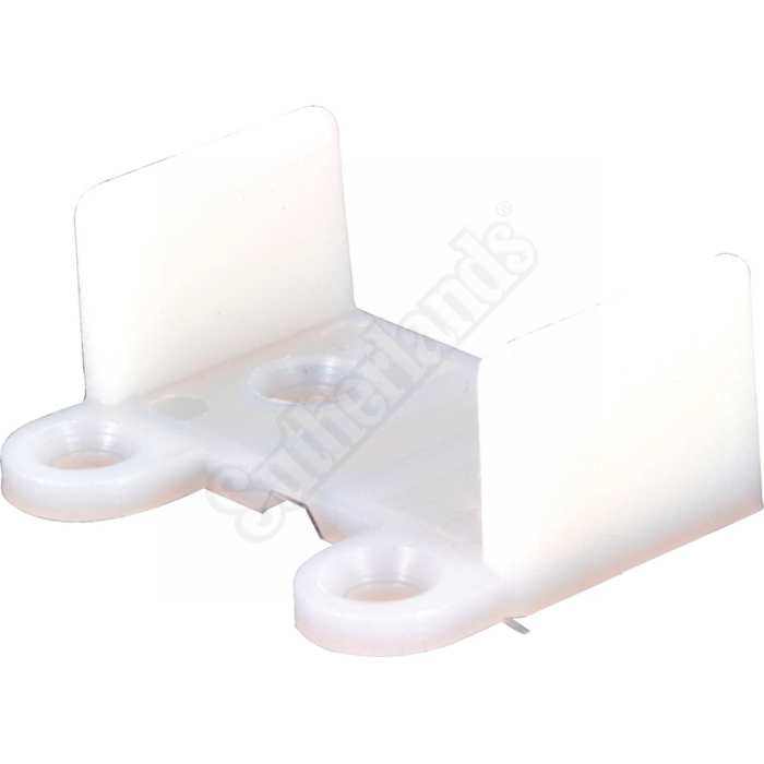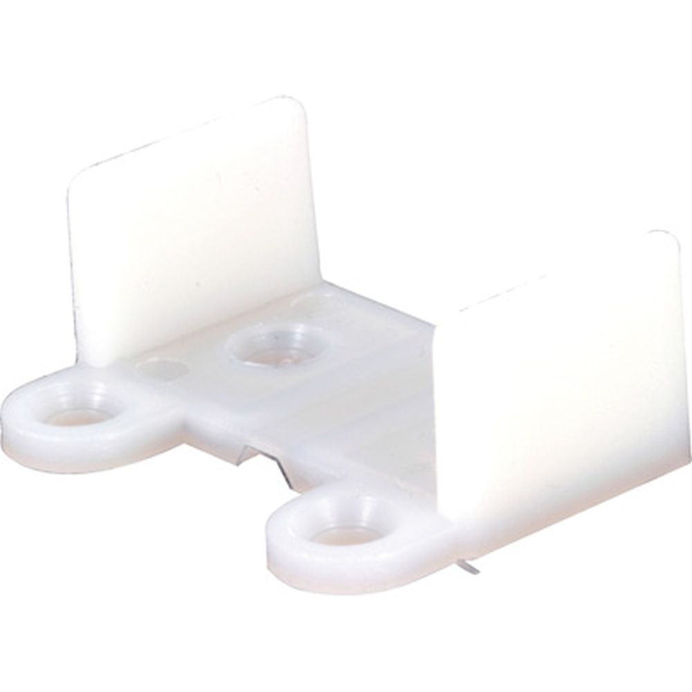 Door Guide, 1-3/8-inch Max Door Width, Plastic, White, Bottom Mount White molded plastic; single door design fits pocket doors and by-passing closet doors; used by many door manufacturers.