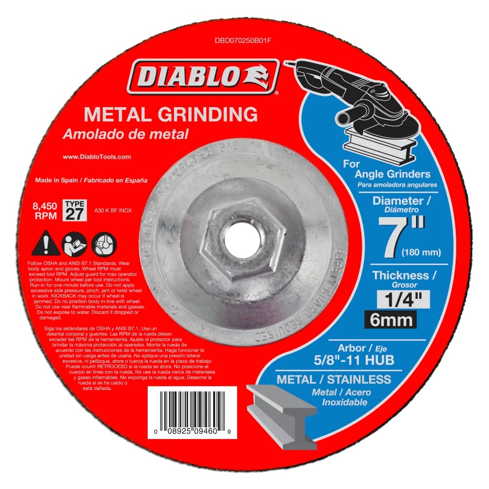 Diablo's premium metal grinding discs provide superior performance and increased productivity. Featuring a premium aluminum oxide blend, these discs grind through material faster than other discs and offer an extra long grinding life. Fully reinforced for use in hand-held cut-off work. Ideal for use when working in hard to reach areas.