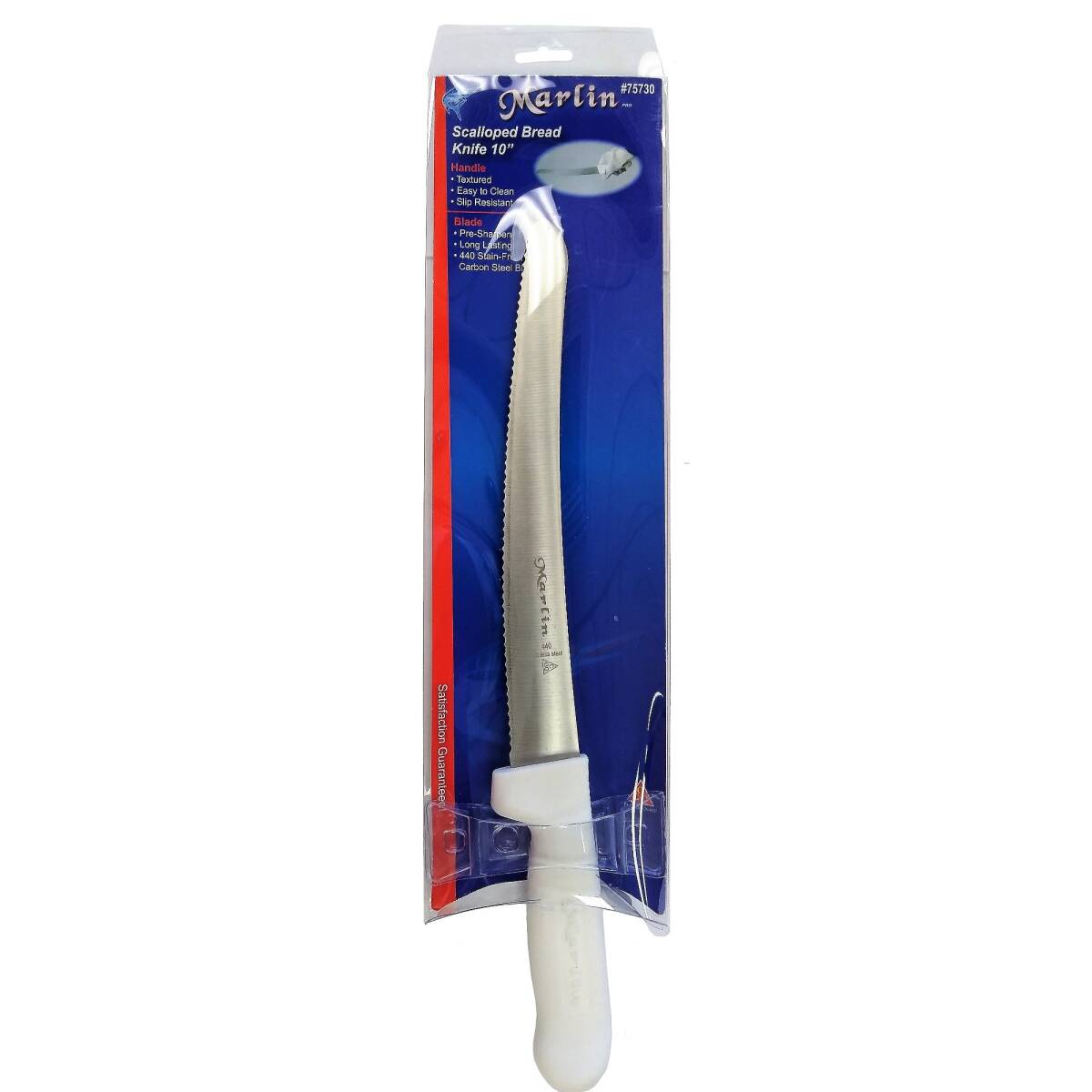 Marlin Pro, Scalloped Bread Knife is 10 in and has a high carbon steel blade with precise edge geometry for cutting and slicing bread. It has a textured, slip resistant, easy-to-clean high impact handle that is able to withstand high and low temperatures. The seal between the blade and the handle creates a more sanitary experience. Chef Grade Quality.